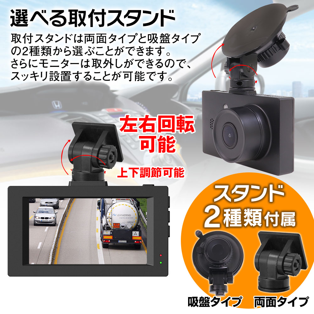 付属のスタンドは両面タイプと吸盤タイプの2種類から選ぶことができます。フロントガラスにお好みの取付スタンドで装着できます。