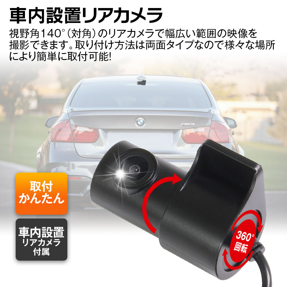 本体×1、シガーアダプター×1、吸盤タイプ取付ステー×1、両面タイプ取付ステー×1 リアカメラ×1、リアカメラ接続ケーブル×1、日本語取扱説明書