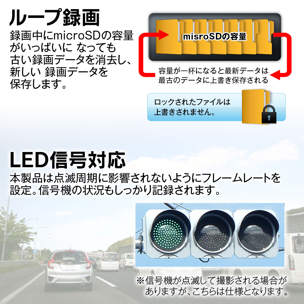 従来の機種はLED信号機の点滅周期に影響され、点滅の間隔が広く点灯していないように映る現象がありましたが、本製品は点滅周期に影響されないようにフレームレートを設定。信号機の状況もしっかり記録されます。
