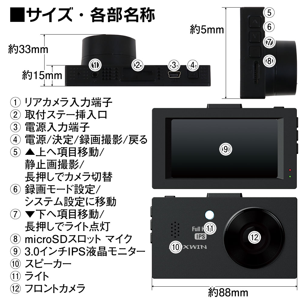 - カメラ視野角:フロント143°、リア140°