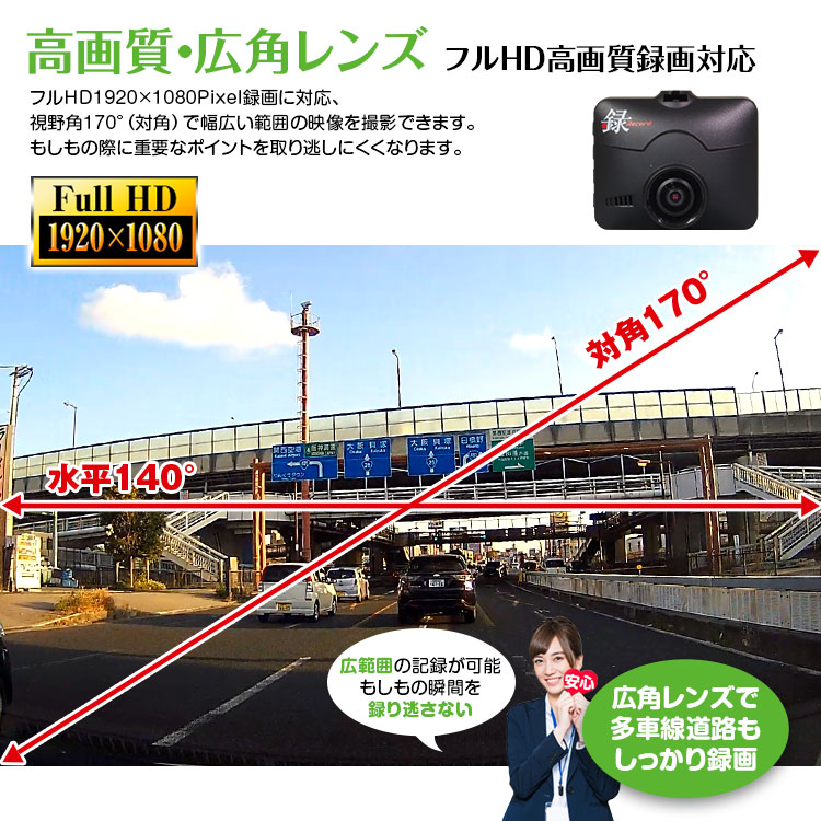 フルHD1920×1080Pixel録画に対応、視野角170°(対角)で幅広い範囲の映像を撮影できます。もしもの際に重要なポイントを取り逃しにくくなります。