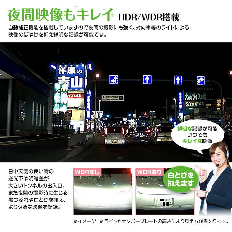 明暗差が激しいトンネルの出入り口や夜間撮影時に生じる黒つぶれや白飛びを抑え、より明瞭な映像を記録します。