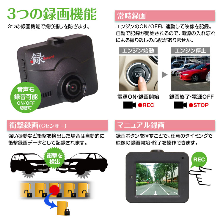 エンジンスタートと同時に電源ON、自動的に録画が開始されます。エンジンを止めると自動的に録画データが保存され、しばらくたって自動的に電源が切れます。車を乗り降りするたびにスイッチを操作する必要がないので、スイッチの入れ忘れによる取り逃しの心配もありません。