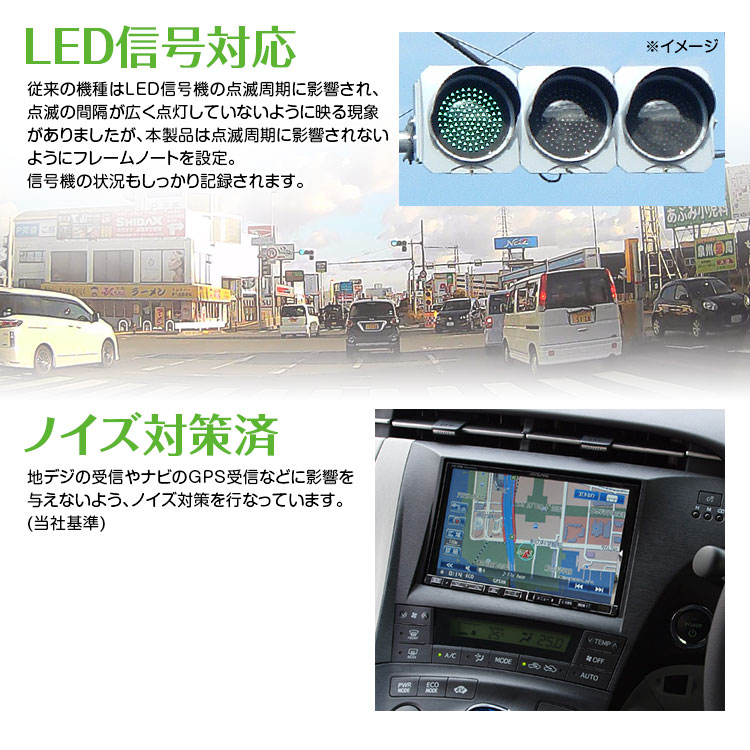 従来の機種はLED信号機の点滅周期に影響され、点滅の間隔が広く点灯していないように映る現象がありましたが、本製品は点滅周期に影響されないようにフレームノートを設定。信号機の状況もしっかり記録されます。
