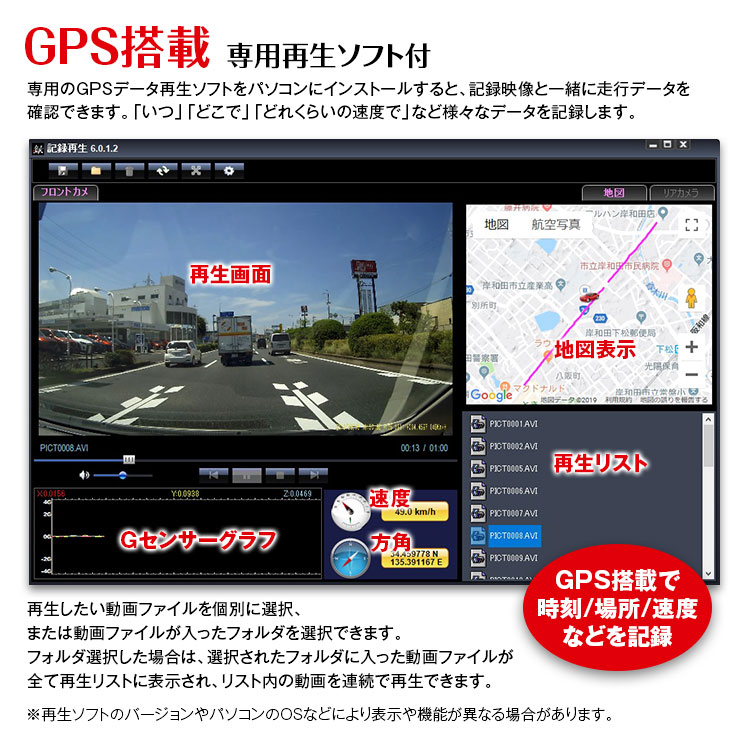 専用のGPSデータ再生ソフトをパソコンにインストールすると、記録映像と一緒に走行データを確認できます。「いつ」「どこで」「どれくらいの速度で」など様々なデータを記録します。
