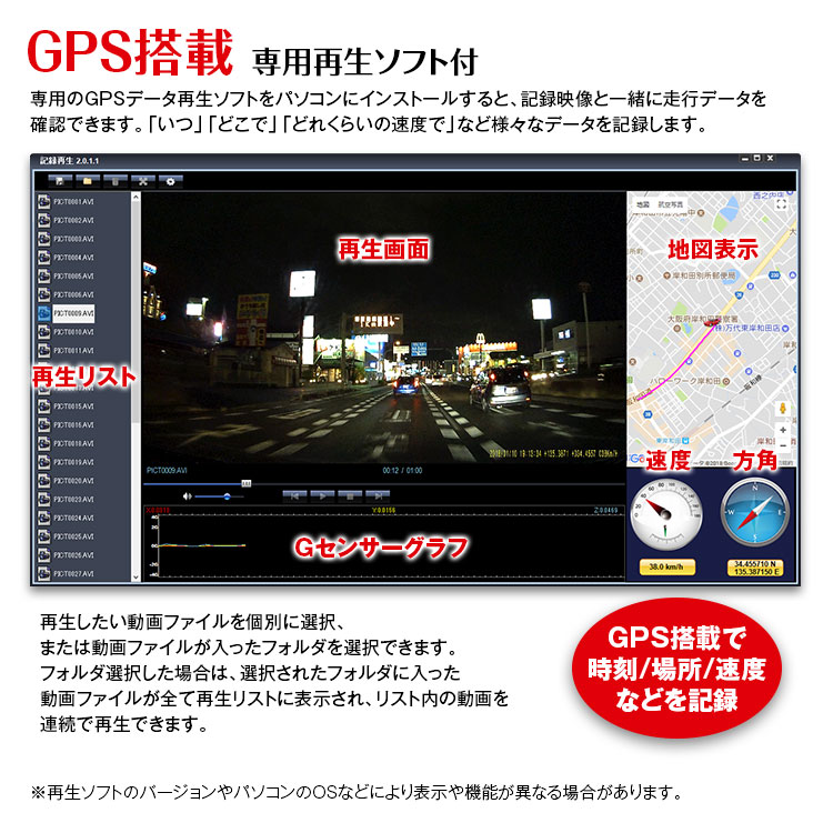 専用のGPSデータ再生ソフトをパソコンにインストールすると、記録映像と一緒に走行データを確認できます。「いつ」「どこで」「どれくらいの速度で」など様々なデータを記録します。