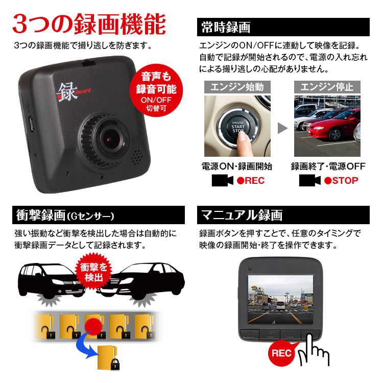 エンジンスタートと同時に電源ON、自動的に録画が開始されます。エンジンを止めると自動的に録画データが保存され、しばらくたって自動的に電源が切れます。車を乗り降りするたびにスイッチを操作する必要がないので、スイッチの入れ忘れによる取り逃しの心配もありません。