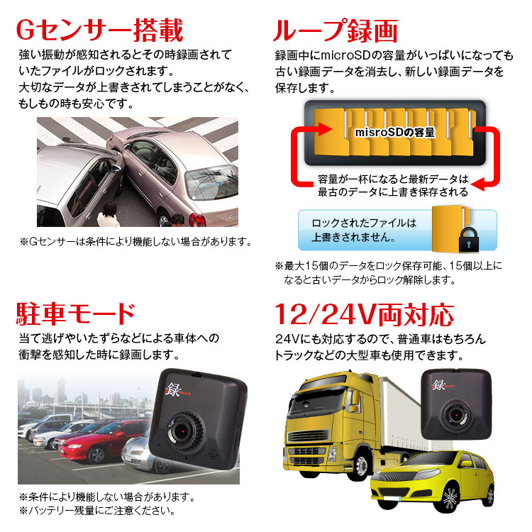 強い振動が感知されるとその時録画されていたファイルがロックされます。大切なデータが上書きされてしまうことがなく、もしもの時も安心です。