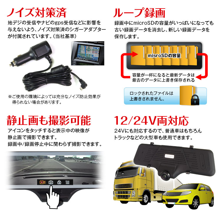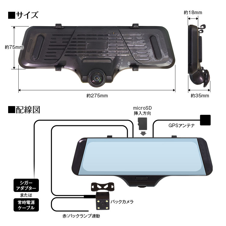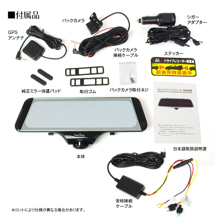本体×1、シガーアダプター×1、バックカメラ×1、バックカメラ接続ケーブル×1、純正ミラー保護パッド×2、取付ゴム×2、バックカメラ取付ネジ×1セット、GPSアンテナ×1、ステッカー×1、日本語取扱説明書