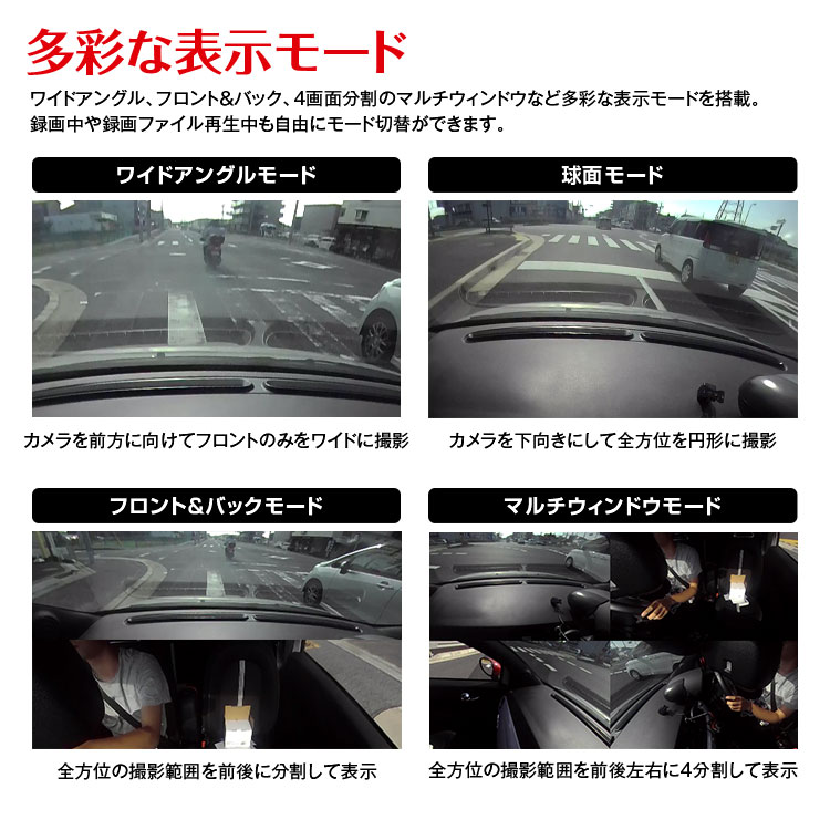 ワイドアングル、フロント&バック、4画面分割のマルチウィンドウなど多彩な表示モードを搭載。
