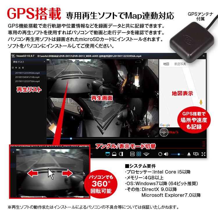 GPS機能搭載で走行軌跡や位置情報などを録画データに記録できます。専用の再生ソフトを使用すればパソコンで動画と走行データを確認できます。パソコンでも表示画面を360°回転可能です。