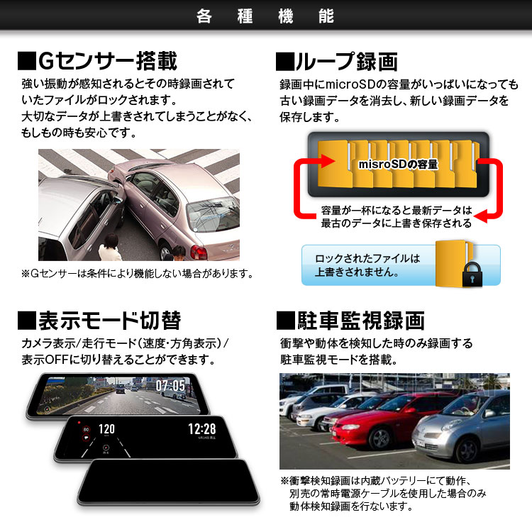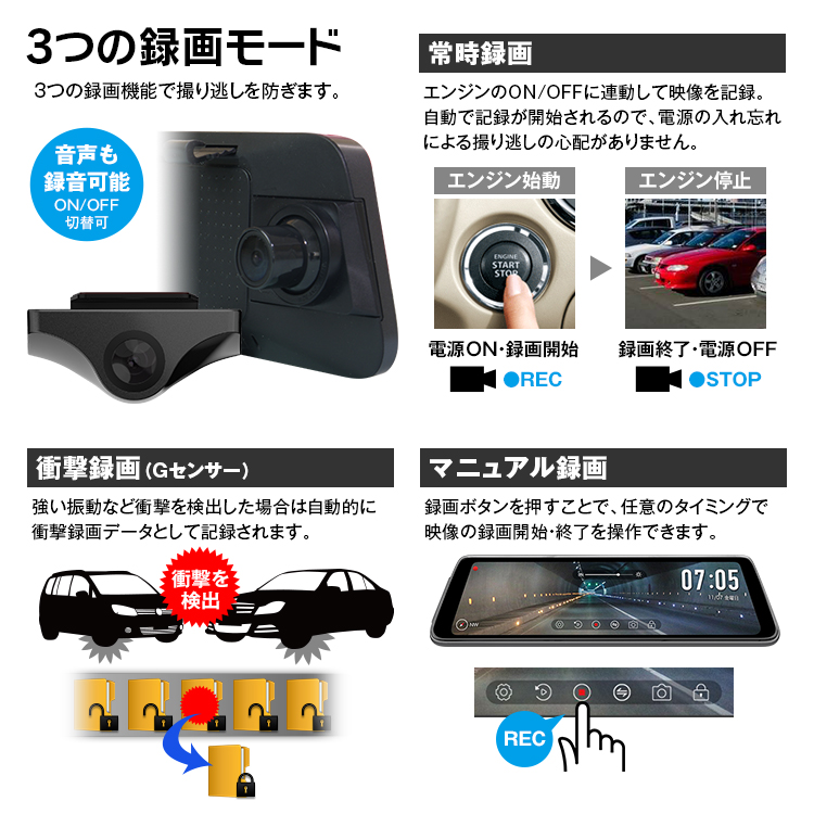 - 記録方式:常時/緊急/駐車監視