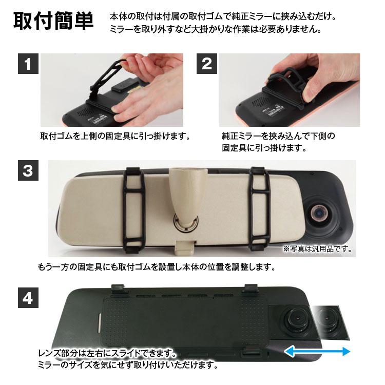 カメラは車内でも車外でも設置できるよう専用ステーを同梱、車種や使用方法によりお選び頂けます。