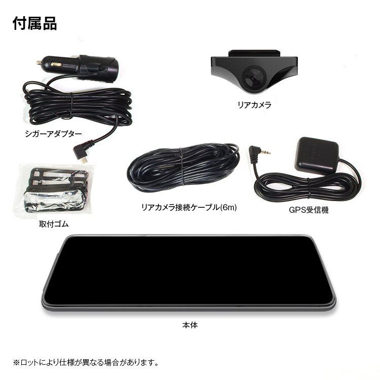本体×1、電源ケーブル×1、リアカメラ×1、リアカメラ接続ケーブル(6m)×1、リアカメラ(0.5mケーブル付、2種類取付ステー付)×1、GPSユニット×1、取扱説明書、保証書×1、本体取付ステー×1、配線カバー×1