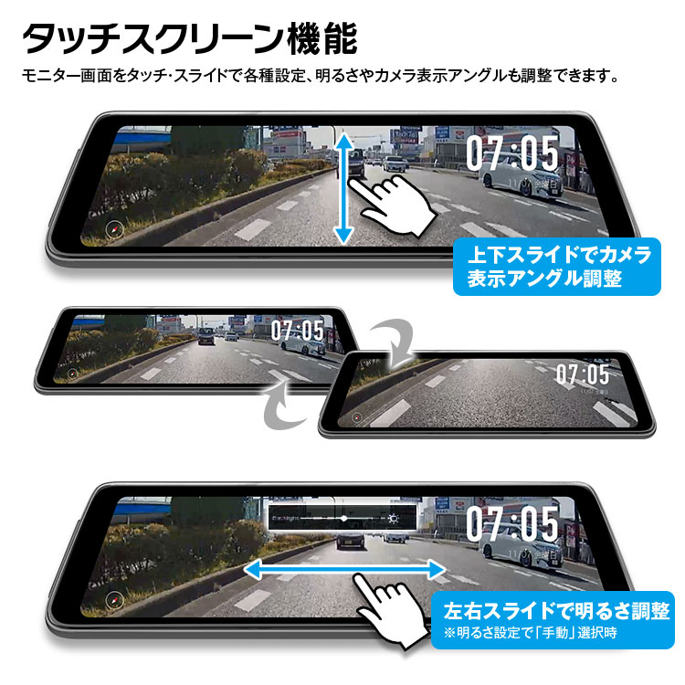 画面を指で上下にスライドしてフロント/リアカメラ画像のアングル調整ができます。より広い範囲を確認できます。