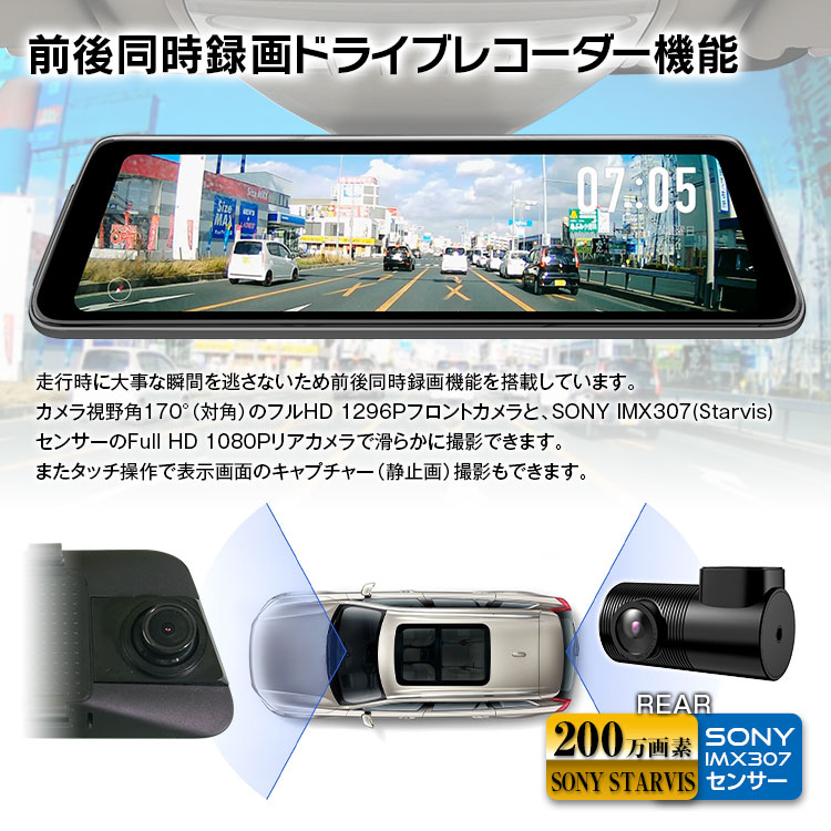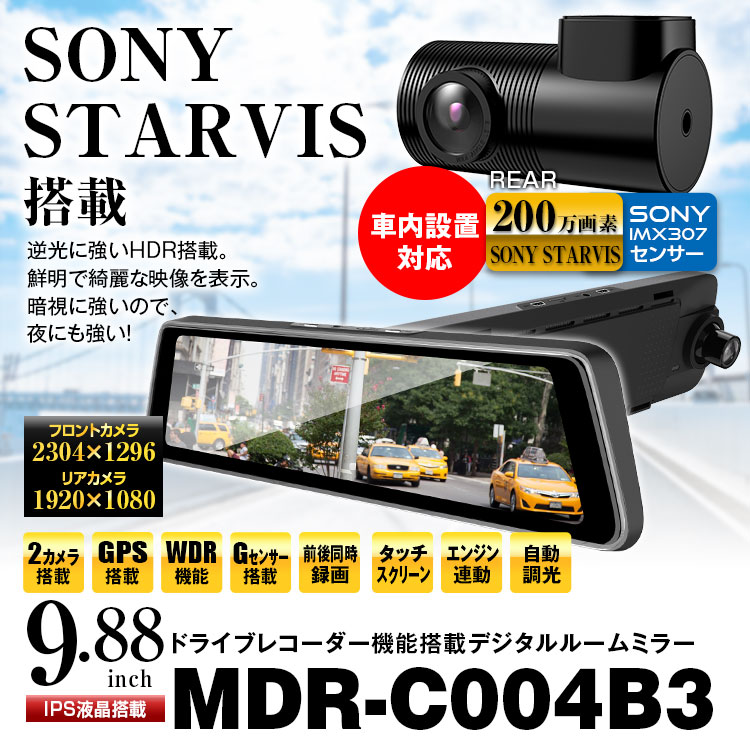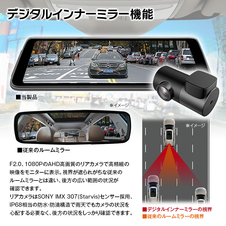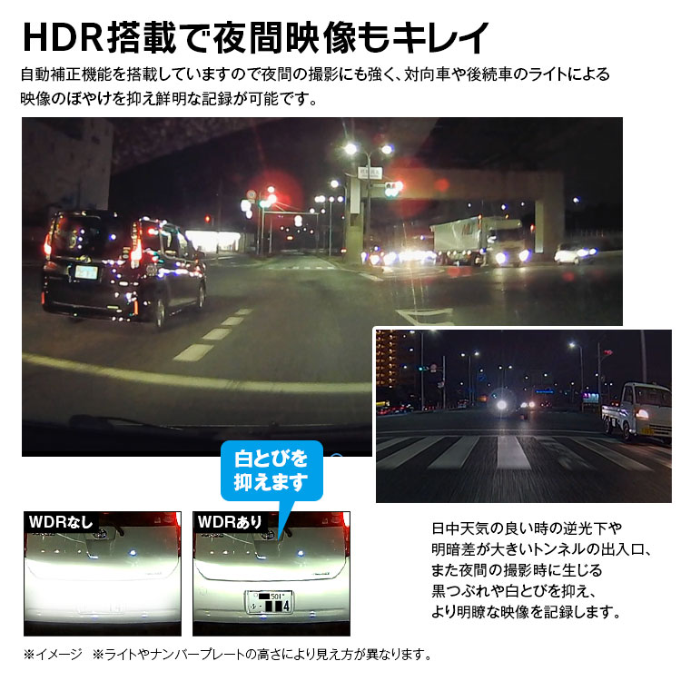 前後カメラとも逆光に強いHDR搭載により明暗差を補正し鮮明で綺麗な映像を表示。悪天候(雨や雪、霧、夜間の路面凍結)時に視認性を高めます。また暗視機能付きで夜間は人間の目より認識できます。
