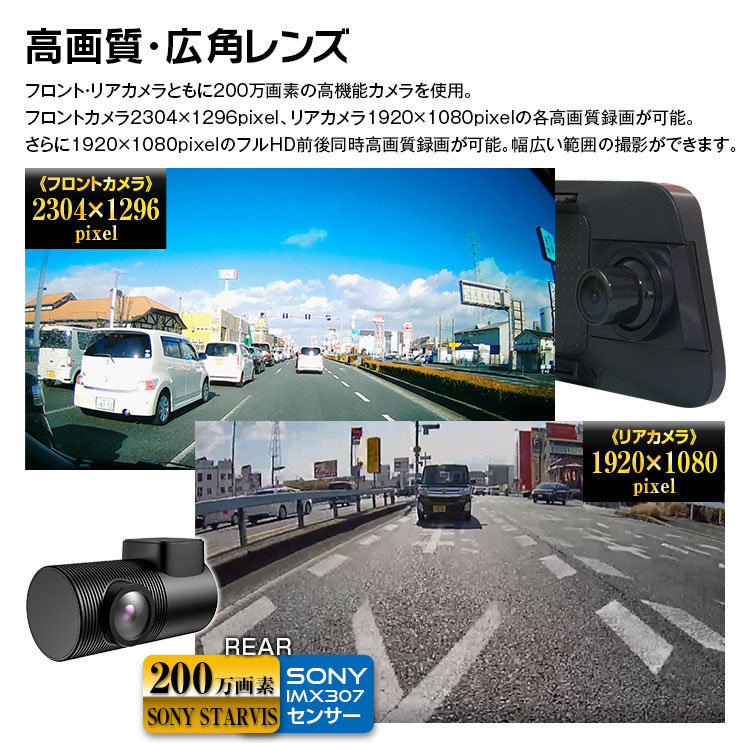フロント200万画素、リア200万画素の高画質カメラで前後同時に滑らかな映像を記録。事故の記録としてだけでなく、ドライブや旅行の思い出を記録するのにも適した高解像度でキレイな映像が楽しめます。