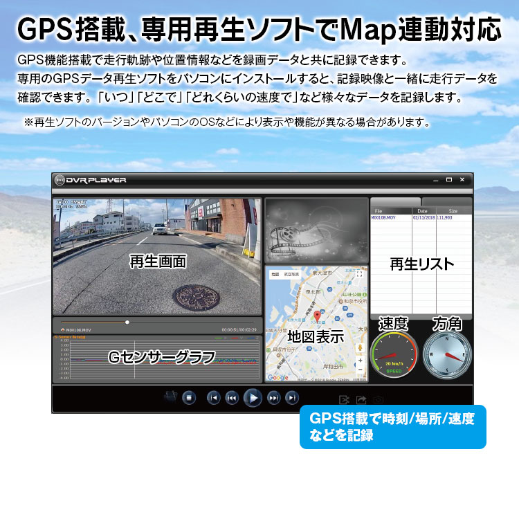 車両の位置情報や、車両速度情報などを映像と同時に記録することが可能。また、日時情報もGPSにより自動で補正されるため、手動で設定する必要はありません。