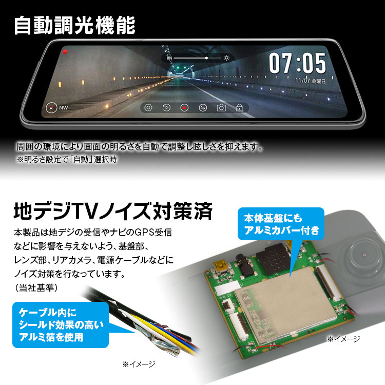 本製品は地デジの受信やナビのGPS受信などに影響を与えないよう、基盤部、レンズ部、リアカメラ、電源ケーブルなどにノイズ対策を行なっています。(当社基準)