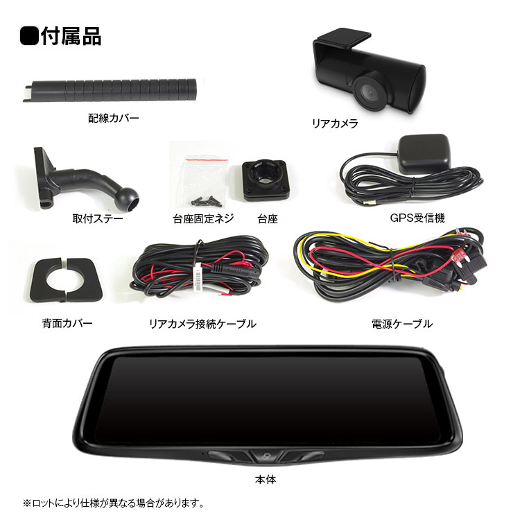 本体×1、電源ケーブル×1、リアカメラ×1、リアカメラ接続ケーブル×1、リアカメラステー×1、GPSユニット×1、取扱説明書・保証書×1、本体取付ステー×1、配線カバー×1
