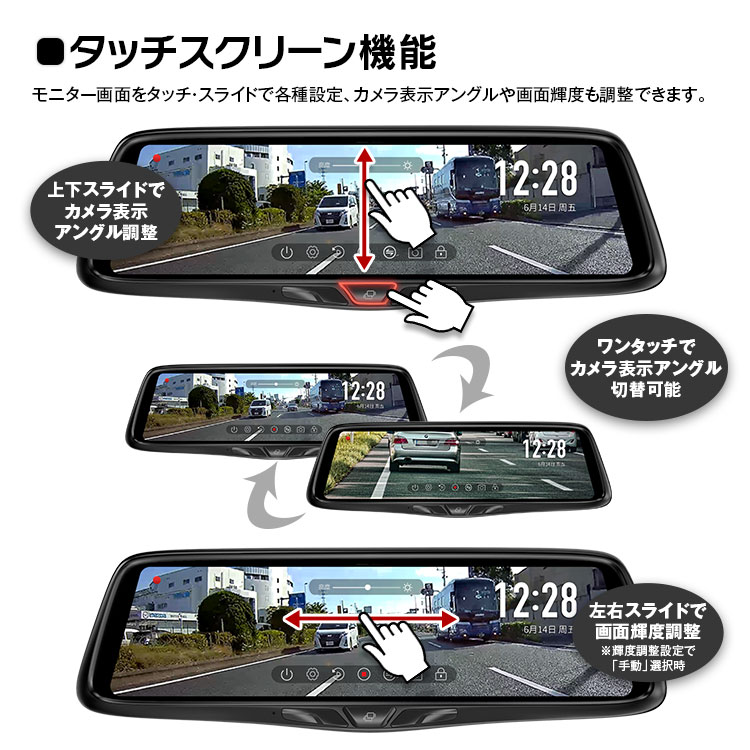 画面を指で上下にスライドしてフロント/リアカメラ画像のアングル調整ができます。より広い範囲を確認できます。