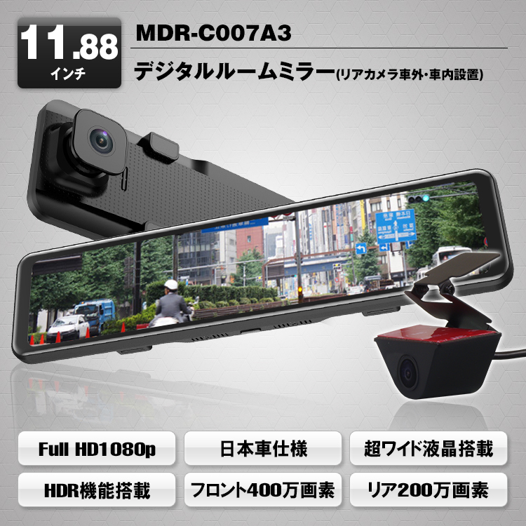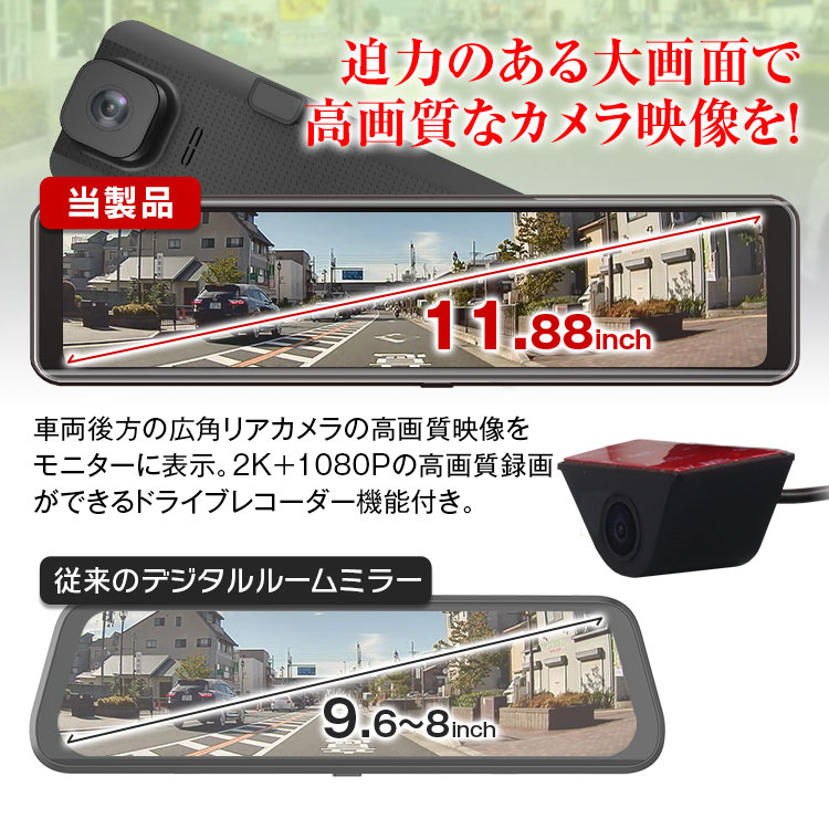 11.88インチ高解像度・高輝度液晶でフル画面表示、操作のしやすい全画面タッチパネル。従来品より画面が大きいので、リアカメラの画角は広いものの距離感がより掴みやすくなりました。細長い形でフロントレンズを引っ張る必要がなくなり、純正のミラーともフィットします。