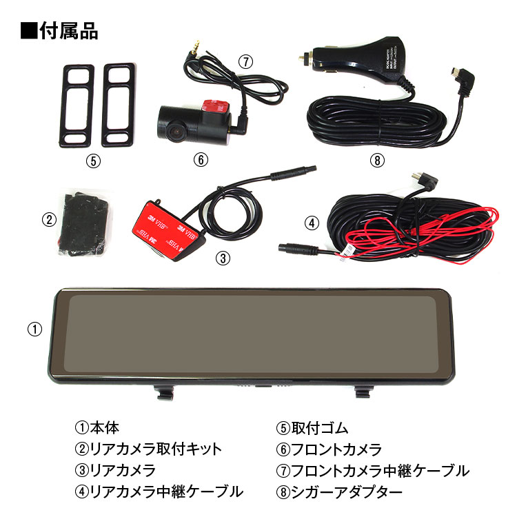 本体×1、シガー電源ケーブル(3.5m)×1、車内専用フロントカメラ、中継ケーブル(0.5m)×1、リアカメラ、中継ケーブル(5.5m)×1、取扱説明書(保証書)×1