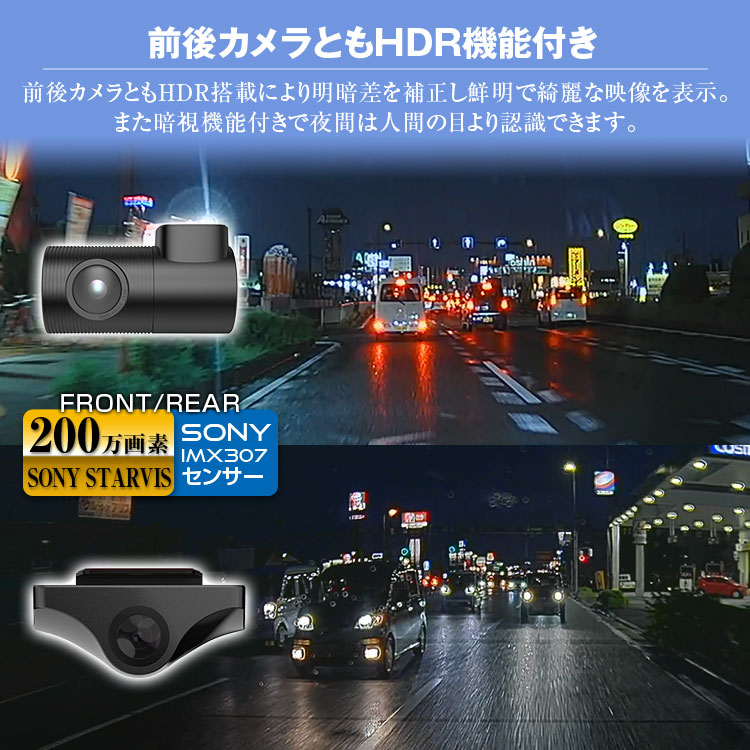 前後カメラとも逆光に強いHDR搭載により明暗差を補正し鮮明で綺麗な映像を表示。悪天候(雨や雪、霧、夜間の路面凍結)時に視認性を高めます。また暗視機能付きで夜間は人間の目より認識できます。