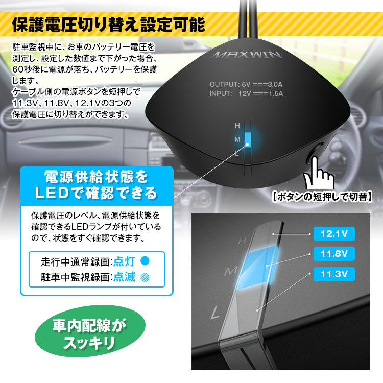 駐車監視中にいつでもお車のバッテリー電圧を測定し、設定した数値よりまで下がった場合、電源が自動的に落ち、バッテリーを保護します。ケーブル側の電源ボタンを短押しで11.3V、11.8V、12.1Vの3つの保護電圧切り替えができます。