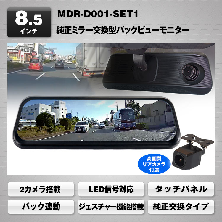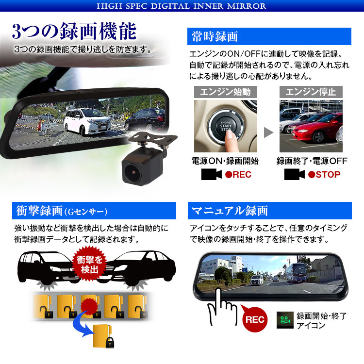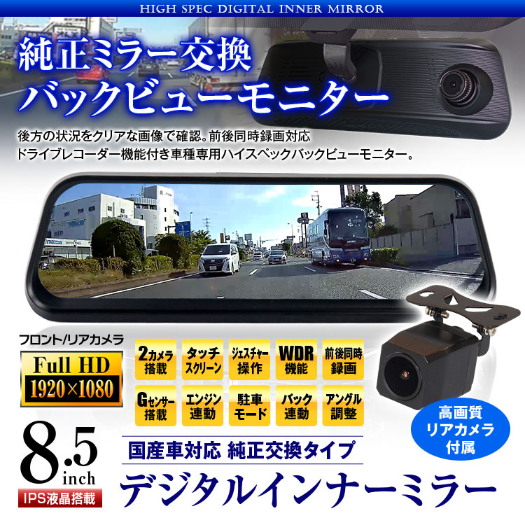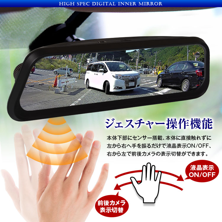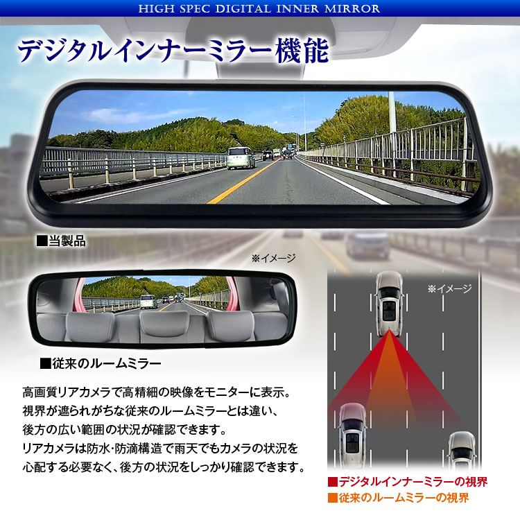純正ミラー交換タイプのデジタルインナーミラー。純正ミラーに近いサイズなので車内の雰囲気を壊さずスッキリ設置できます。車両後方のフルHD広角カメラの映像をミラーモニターに表示。従来のルームミラーより視界が約3倍、車体や荷物などで生じる後方の死角を減らし安全性もアップします。