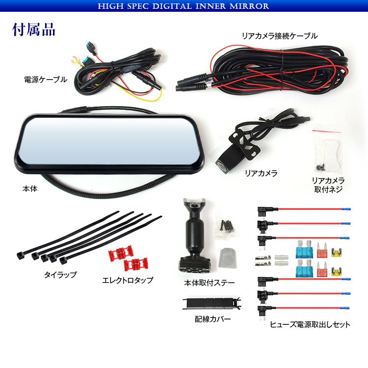本体×1、電源ケーブル×1、リアカメラ×1、リアカメラ接続ケーブル×1、リアカメラ取付ネジ、本体取付ステー×1、配線カバー×1、タイラップ×5、エレクトロタップ×2、ヒューズ電源取り出しセット、