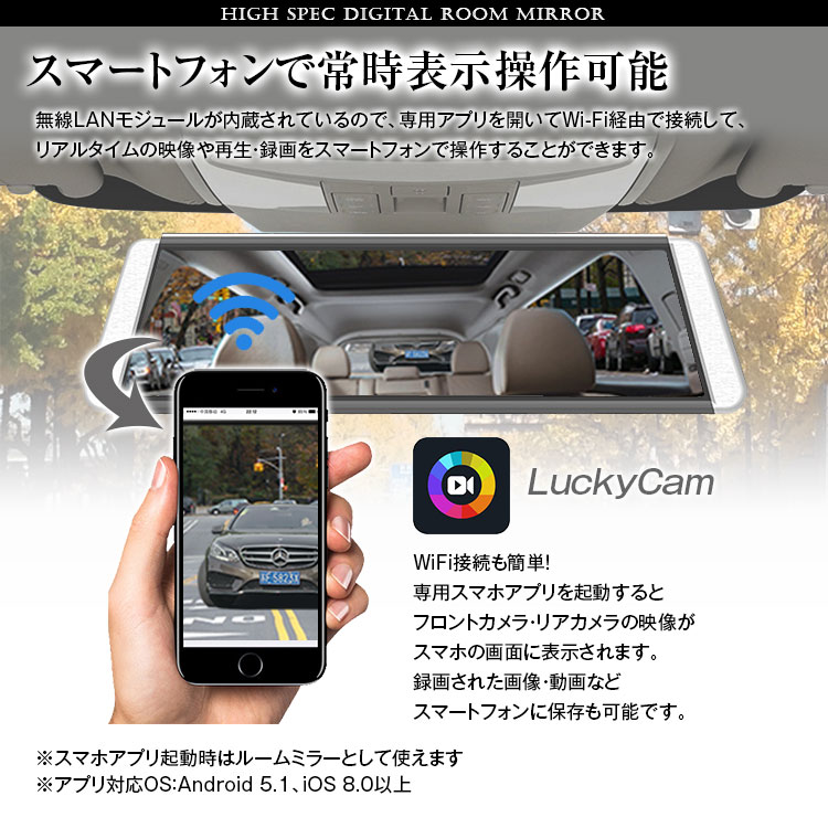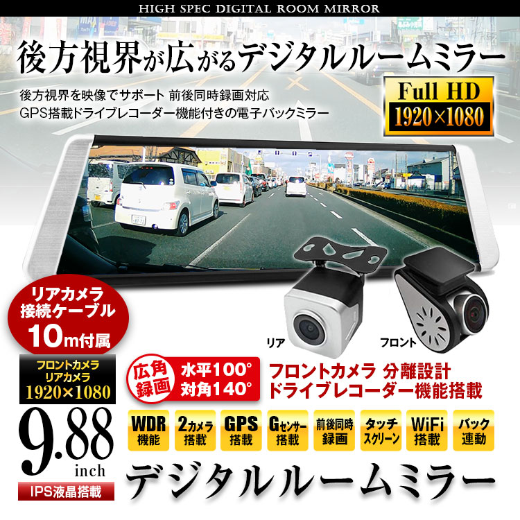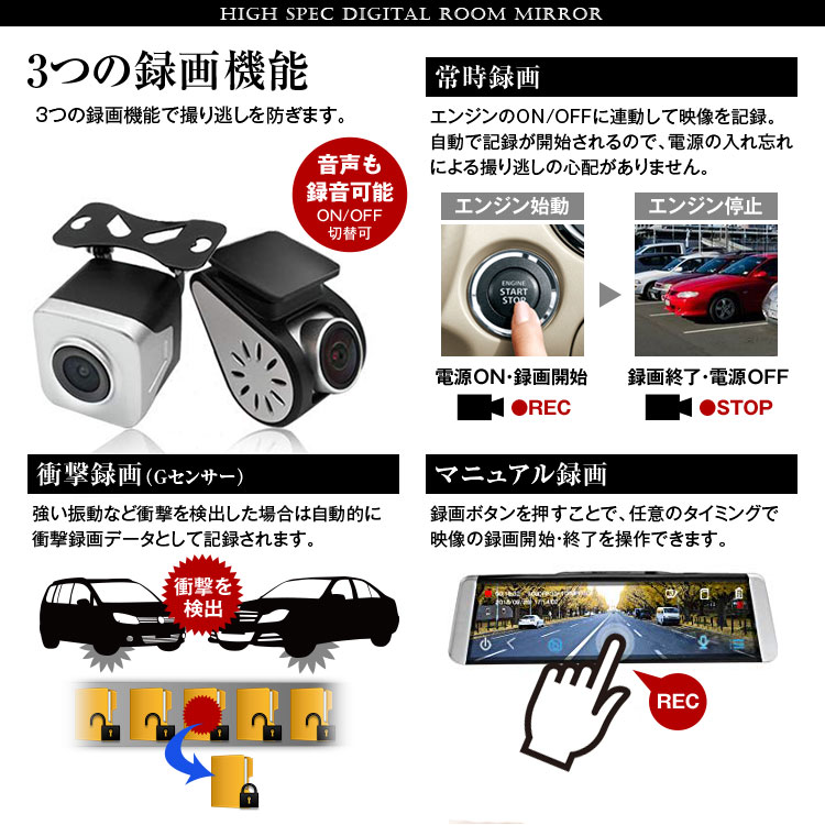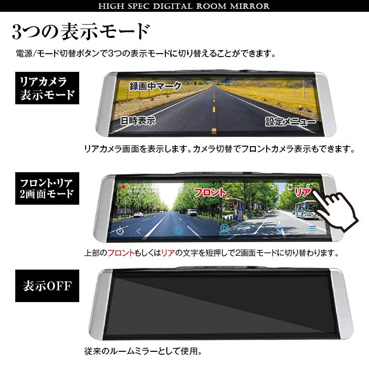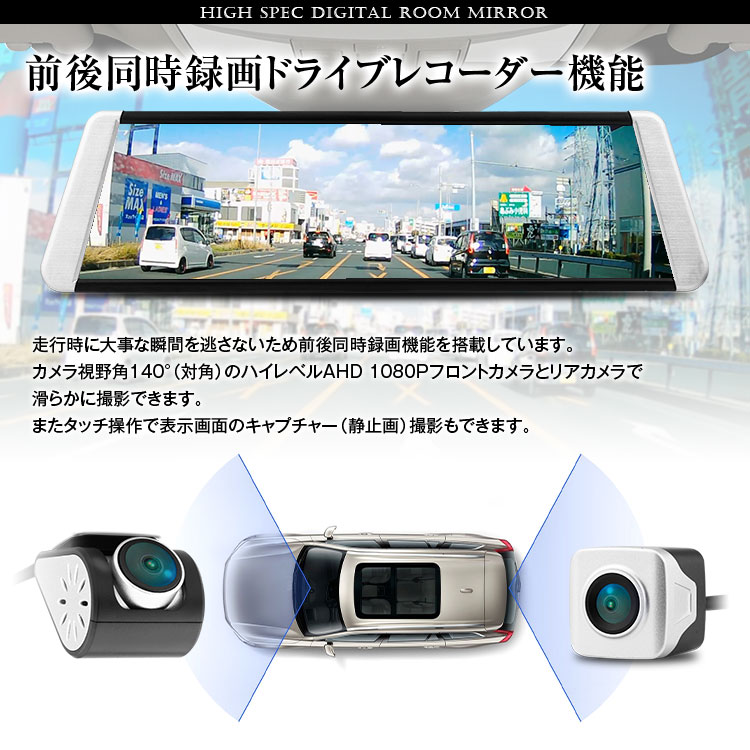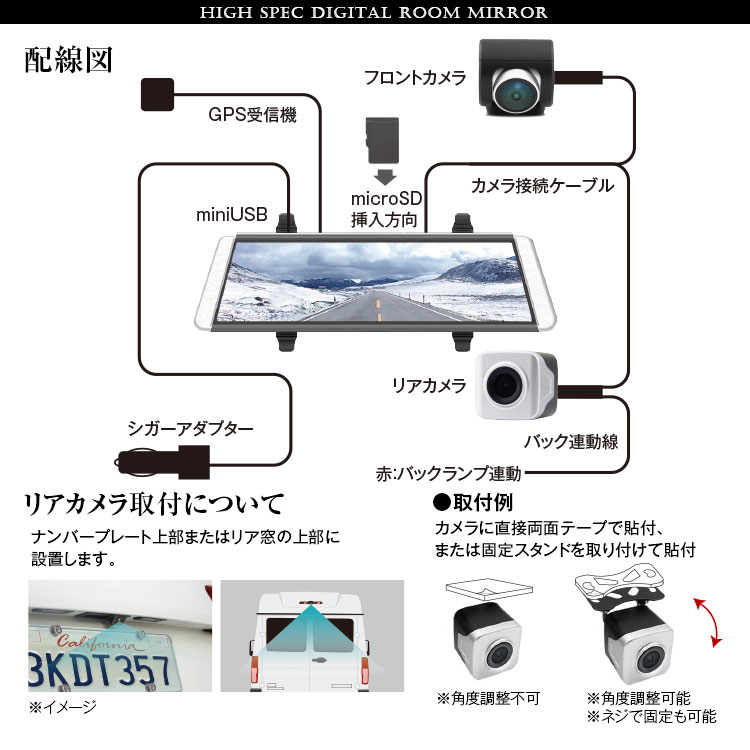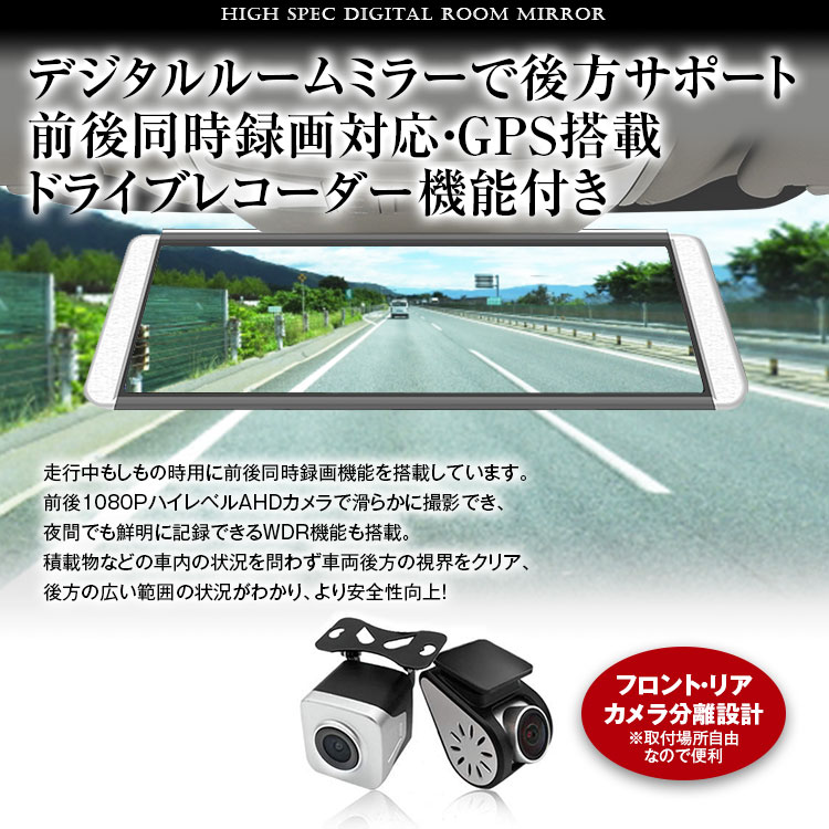 後方視界を映像でサポート 前後同時録画対応・GPS搭載ドライブレコーダー機能付きの電子バックミラー 積載物などの車内の状況を問わず車両後方の視界をクリア、後方の広い範囲の状況がわかり、より安全性向上!
