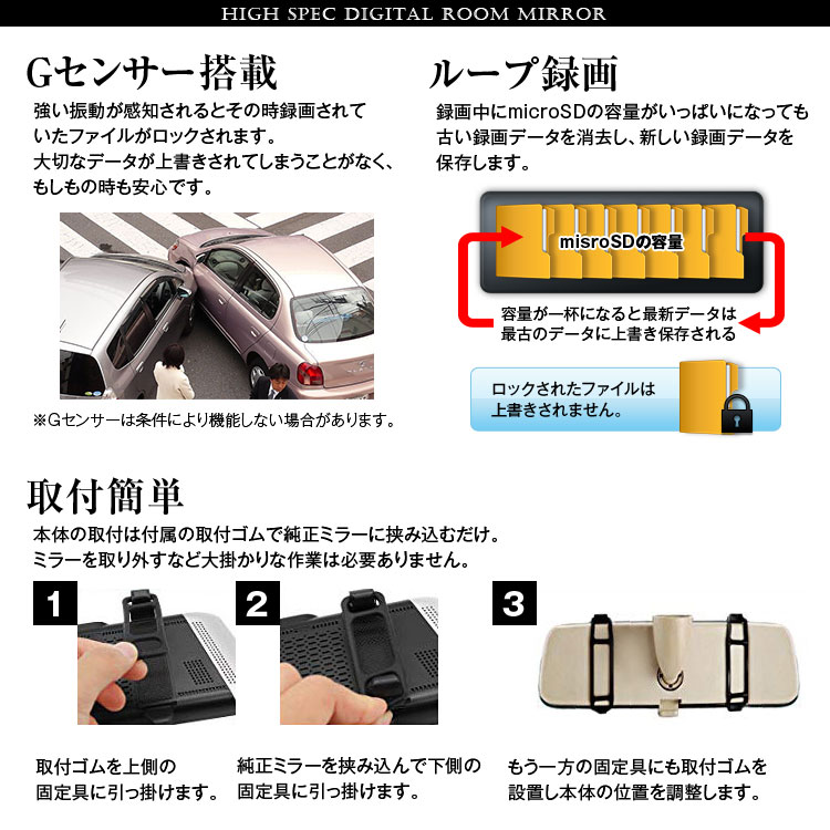 強い振動が感知されるとその時録画されていたファイルがロックされます。大切なデータが上書きされてしまうことがなく、もしもの時も安心です。
