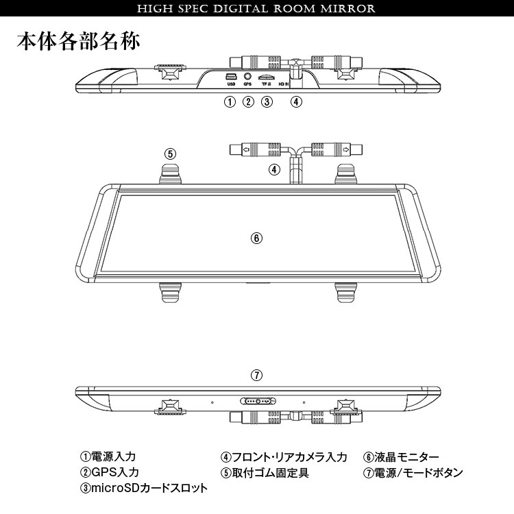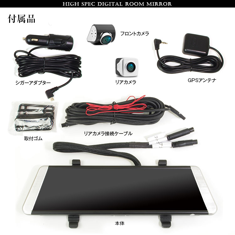 本体×1、フロントカメラ×1 リアカメラ×1、リアカメラ接続ケーブル×1、シガーアダプター×1、GPSアンテナ×1、本体取付ゴム、リアカメラ取付キット