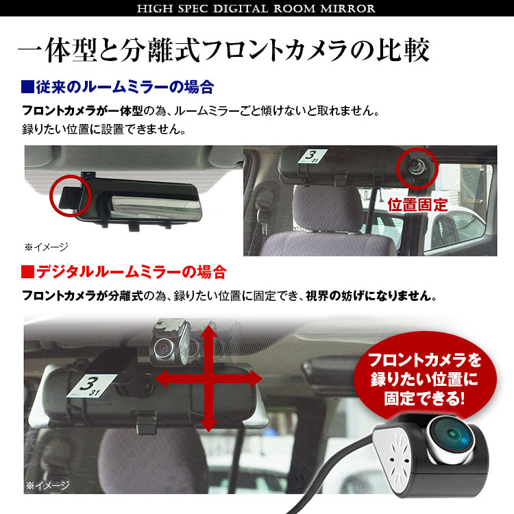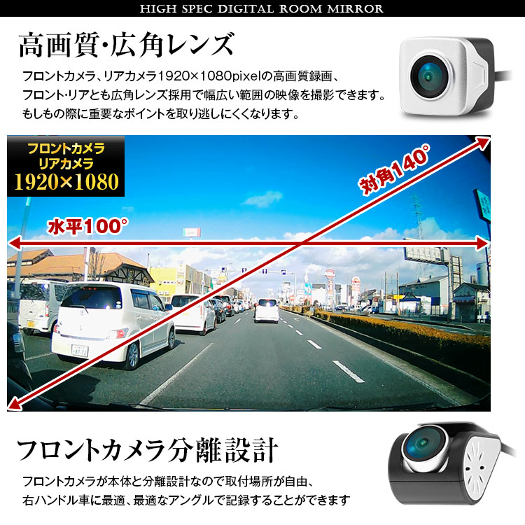 フロントカメラが本体と分離設計なので取付場所が自由、右ハンドル車に最適、最適なアングルで記録することができます。