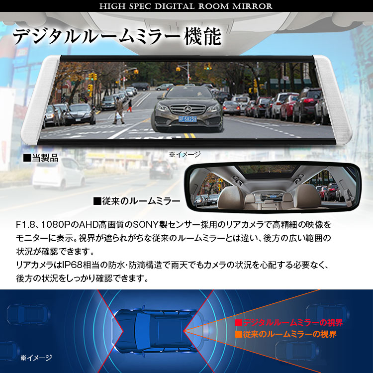 F1.8、1080PのAHD高画質のSONY製センサー採用のリアカメラで高精細の映像をモニターに表示。視界が遮られがちな従来のルームミラーとは違い、後方の広い範囲の状況が確認できます。リアカメラはIP68相当の防水・防滴構造で雨天でもカメラの状況を心配する必要なく、後方の状況をしっかり確認できます。