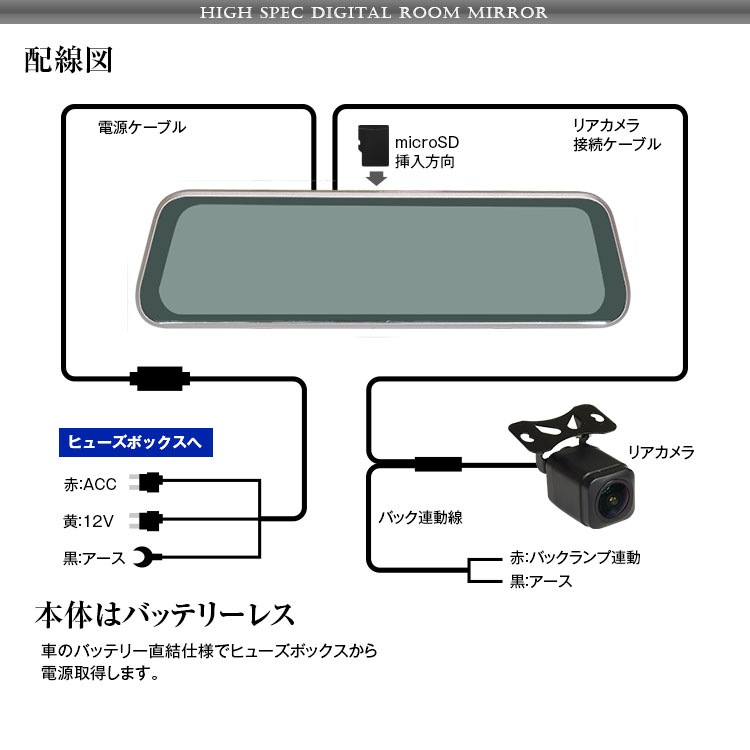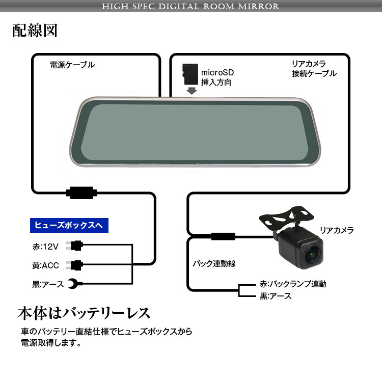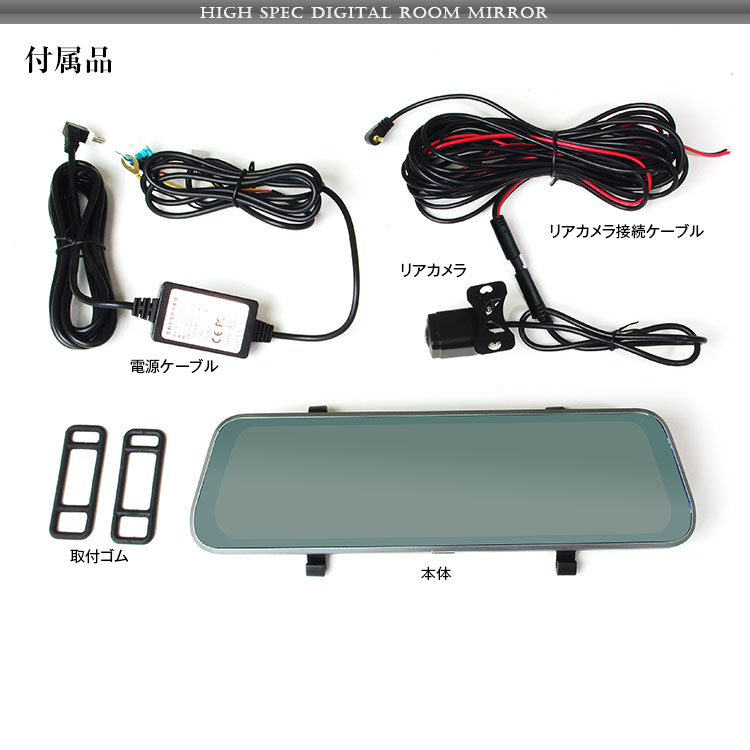 本体×1、リアカメラ×1、リアカメラ接続ケーブル×1、ミラー取付ゴム×2、電源取得ケーブル×1、取扱説明書