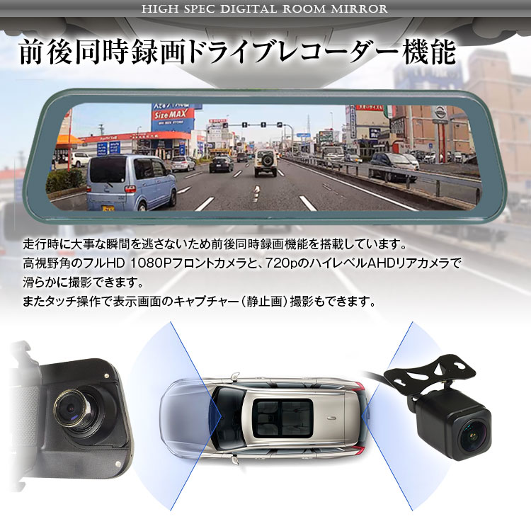 本体のカメラとバックカメラで前後同時録画可能!ミラー全体に映像が映し出され前後の映像を同時に録画できます。