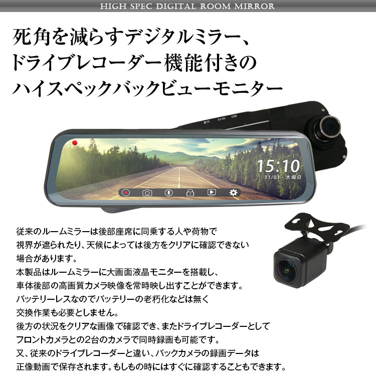 視界が遮られがちな従来のミラー型ドライブレコーダーと違い、液晶全体に映像が映し出され、従来のルームミラー同様の映像を見ることが可能。