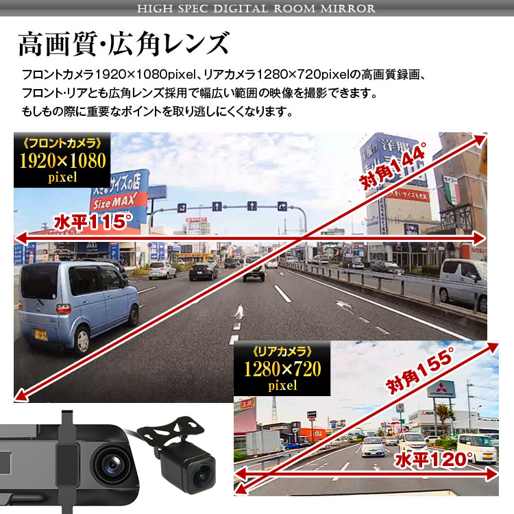 - カメラ視野角:フロント水平115度/対角144度 リア水平120度/対角155度