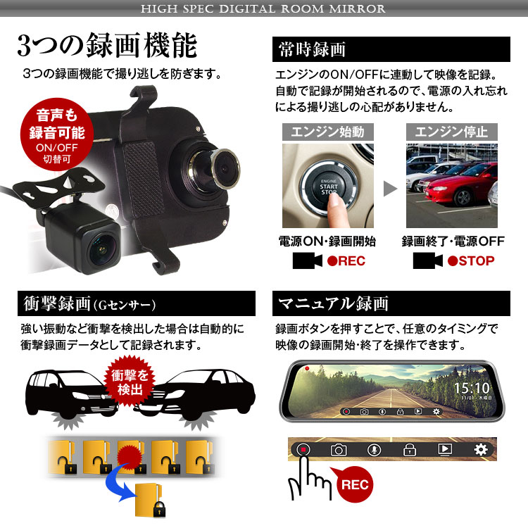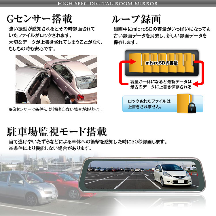 強い振動が感知されるとその時録画されていたファイルがロックされます。大切なデータが上書きされてしまうことがなく、もしもの時も安心です。