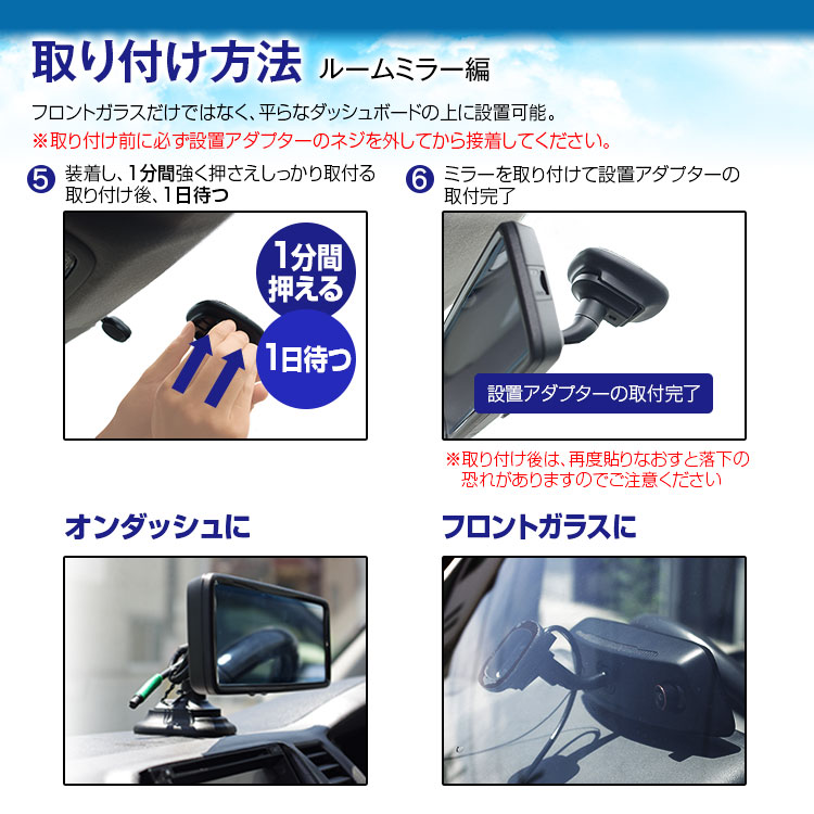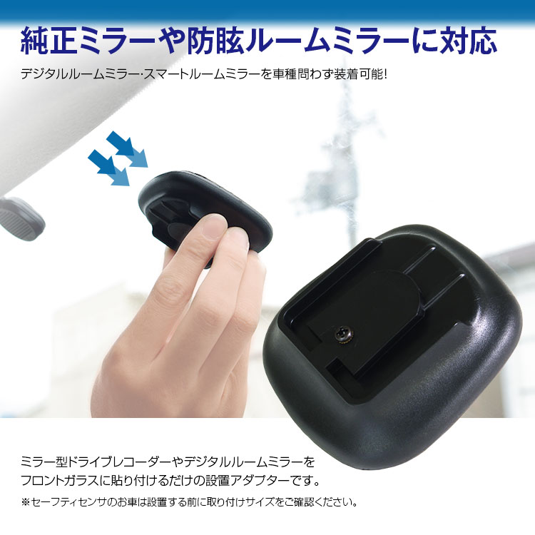取り付けはフロントガラスに貼り付けるだけの汎用ルームミラー設置アダプターです。純正ルームミラーの型番や車種を問わずに様々な車に取り付けます!フロントウィンドウ取り付けタイプではない車にも装着可能!