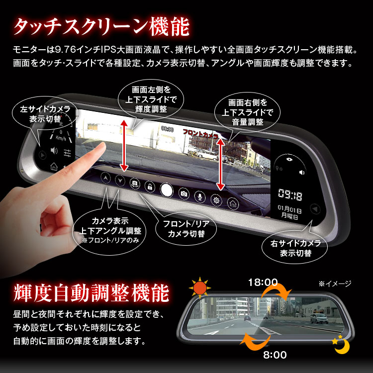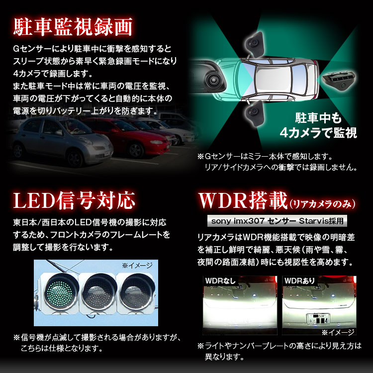 - カメラ視野角:《フロント》水平100°対角145°《リア》水平127°対角153° 《サイド》水平90°対角110°