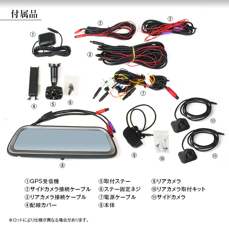 本体×1、リアカメラ×1、リアカメラ取付キット×1、リアカメラ接続ケーブル×1、サイドカメラ×2、サイドカメラ接続ケーブル×2、ホールソー×1、六角レンチ×1、配線カバー×1、電源ケーブル×1、取付ステー×1、GPS受信機×1