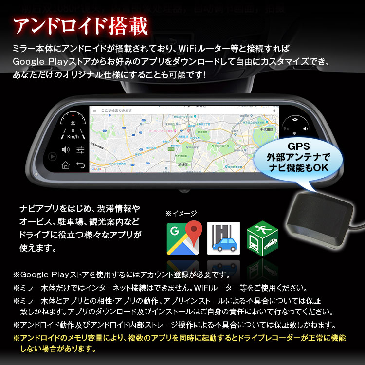 ミラー本体にアンドロイドが搭載されており、WiFiルーター等と接続すればGoogle Playストアからお好みのアプリをダウンロードして自由にカスタマイズできます。GPS受信機付属なのでナビアプリを使用することもできます。