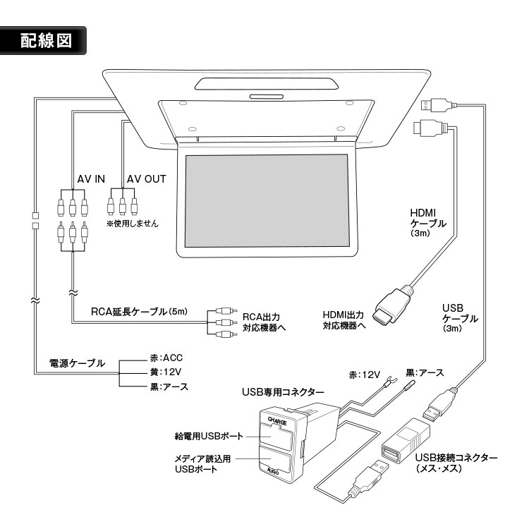 本体×1、リモコン×1、固定用ブラケット×1、電源ケーブル×1、RCA延長ケーブル×1、HDMIケーブル×1、USBケーブル×1、USB専用コネクター×1、USB接続コネクター×1、車体固定ボルト×4、本体固定ネジ/ネジ隠し×4、タイラップ×8、両面テープ×4、エレクトロタップ×2、モニター取付用型紙、取付説明書