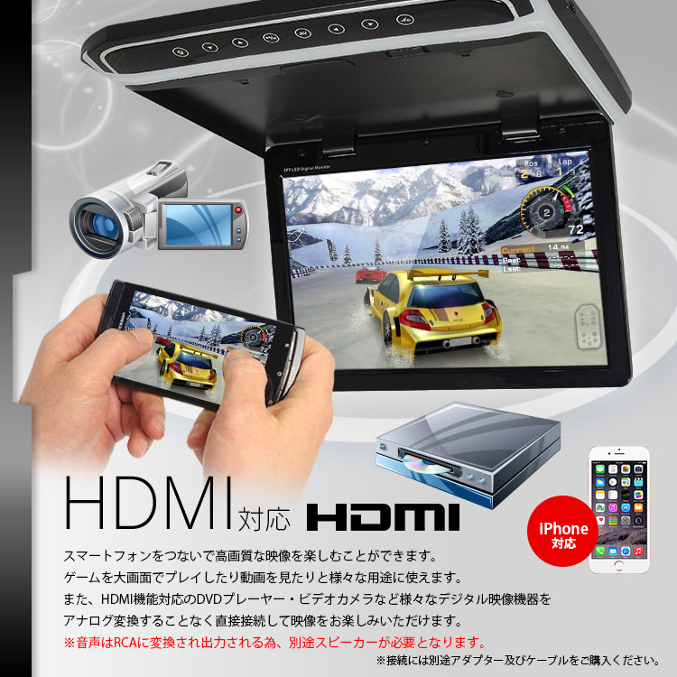 スマートフォンなどHDMI対応機器をつないで、高画質な映像を楽しむことができます。音声はアナログRCA音声出力に変換されます。