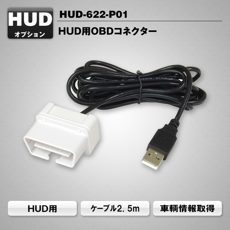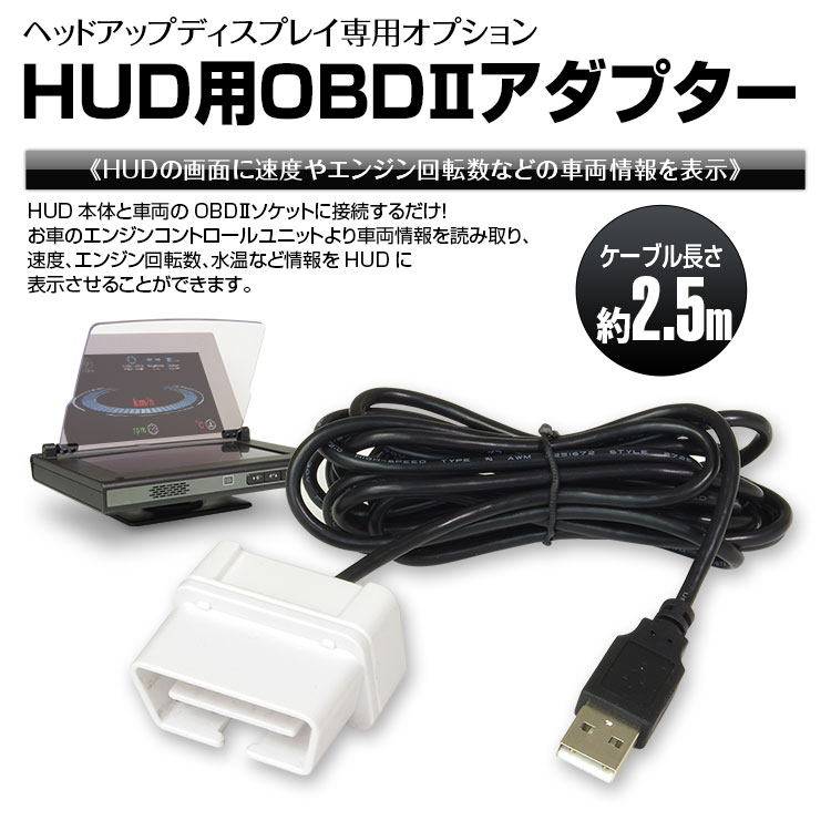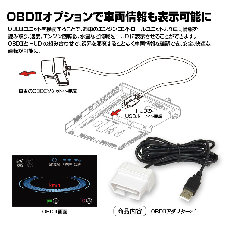 OBDUユニットを接続することで、お車のエンジンコントロールユニットより車両情報を読み取り、速度、エンジン回転数、水温など情報をHUDに表示させることができます。OBDUとHUDの組み合わせで、視界を邪魔することなく車両情報を確認でき、安全、快適な運転が可能になりました。