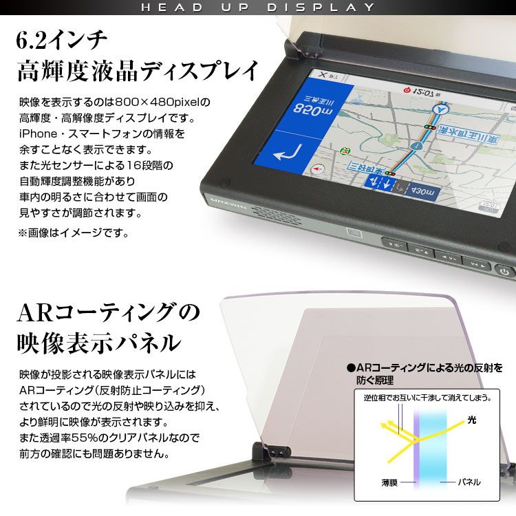 液晶画面に映し出される映像をARコート(反射防止コーティング)された特殊な映像表示パネルに投影させドライバーに提供するアイテムです。映像表示パネルは非常に透過率が高いので同時に前方の安全も確認できます。