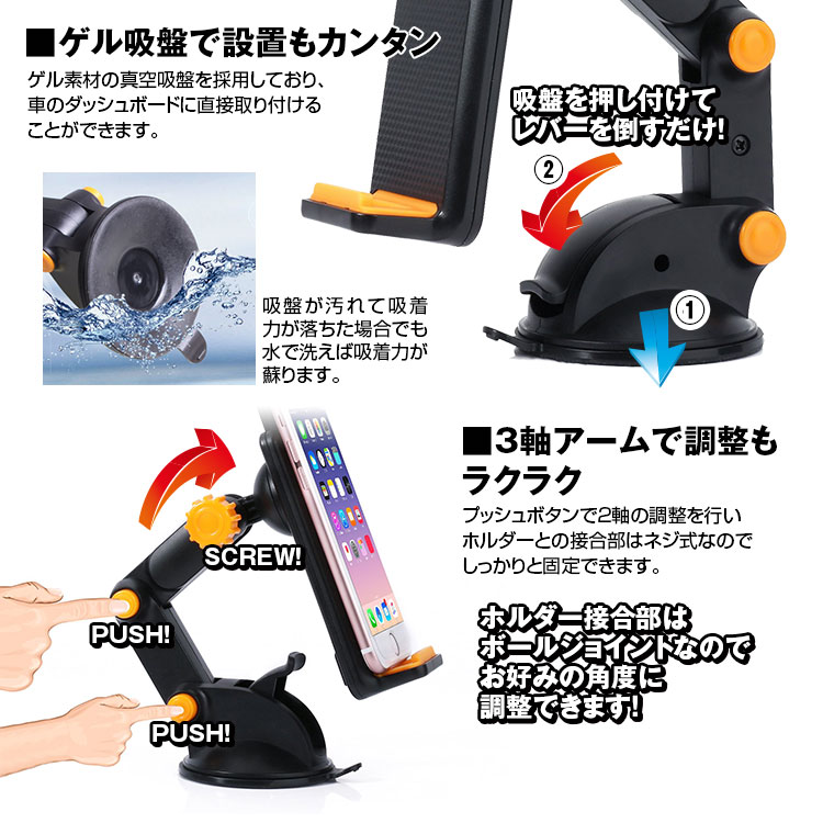 ゲル素材の真空吸盤を採用しており、車のダッシュボードに直接取り付けることができます。 吸盤が汚れて吸着力が落ちた場合でも水で洗えば吸着力が蘇ります。